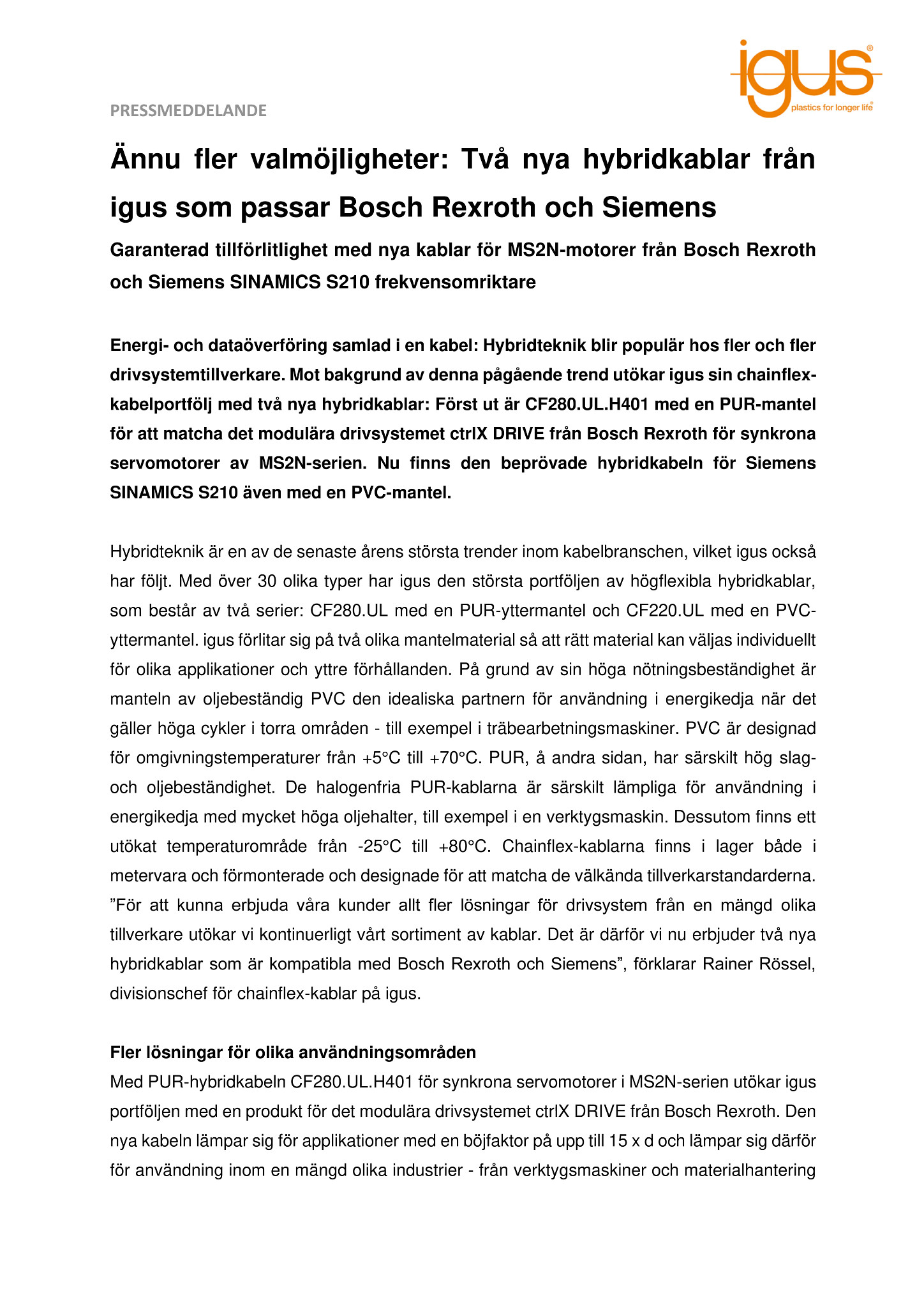 Hybridteknik är en av de senaste årens största trender inom kabelbranschen, vilket igus också har följt. Med över 30 olika typer har igus den största portföljen av högflexibla hybridkablar, som består av två serier: CF280.UL med en PUR-yttermantel och CF220.UL med en PVC-yttermantel. igus förlitar sig på två olika mantelmaterial så att rätt material kan väljas individuellt för olika applikationer och yttre förhållanden. På grund av sin höga nötningsbeständighet är manteln av oljebeständig PVC den idealiska partnern för användning i energikedja när det gäller höga cykler i torra områden – till exempel i träbearbetningsmaskiner. PVC är designad för omgivningstemperaturer från +5°C till +70°C. PUR, å andra sidan, har särskilt hög slag- och oljebeständighet. De halogenfria PUR-kablarna är särskilt lämpliga för användning i energikedja med mycket höga oljehalter, till exempel i en verktygsmaskin. Dessutom finns ett utökat temperaturområde från -25°C till +80°C. Chainflex-kablarna finns i lager både i metervara och förmonterade och designade för att matcha de välkända tillverkarstandarderna. ”För att kunna erbjuda våra kunder allt fler lösningar för drivsystem från en mängd olika tillverkare utökar vi kontinuerligt vårt sortiment av kablar. Det är därför vi nu erbjuder två nya hybridkablar som är kompatibla med Bosch Rexroth och Siemens”, förklarar Rainer Rössel, divisionschef för chainflex-kablar på igus.