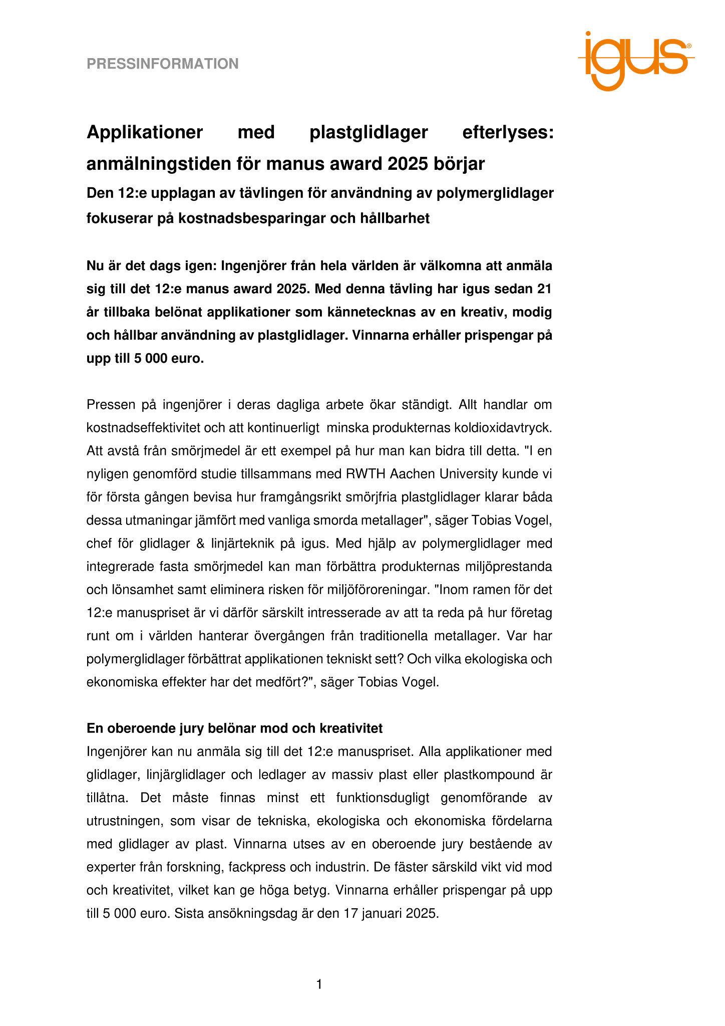 Nu är det dags igen: Ingenjörer från hela världen är välkomna att anmäla sig till det 12:e manus award 2025. Med denna tävling har igus sedan 21 år tillbaka belönat applikationer som kännetecknas av en kreativ, modig och hållbar användning av plastglidlager. Vinnarna erhåller prispengar på upp till 5 000 euro.