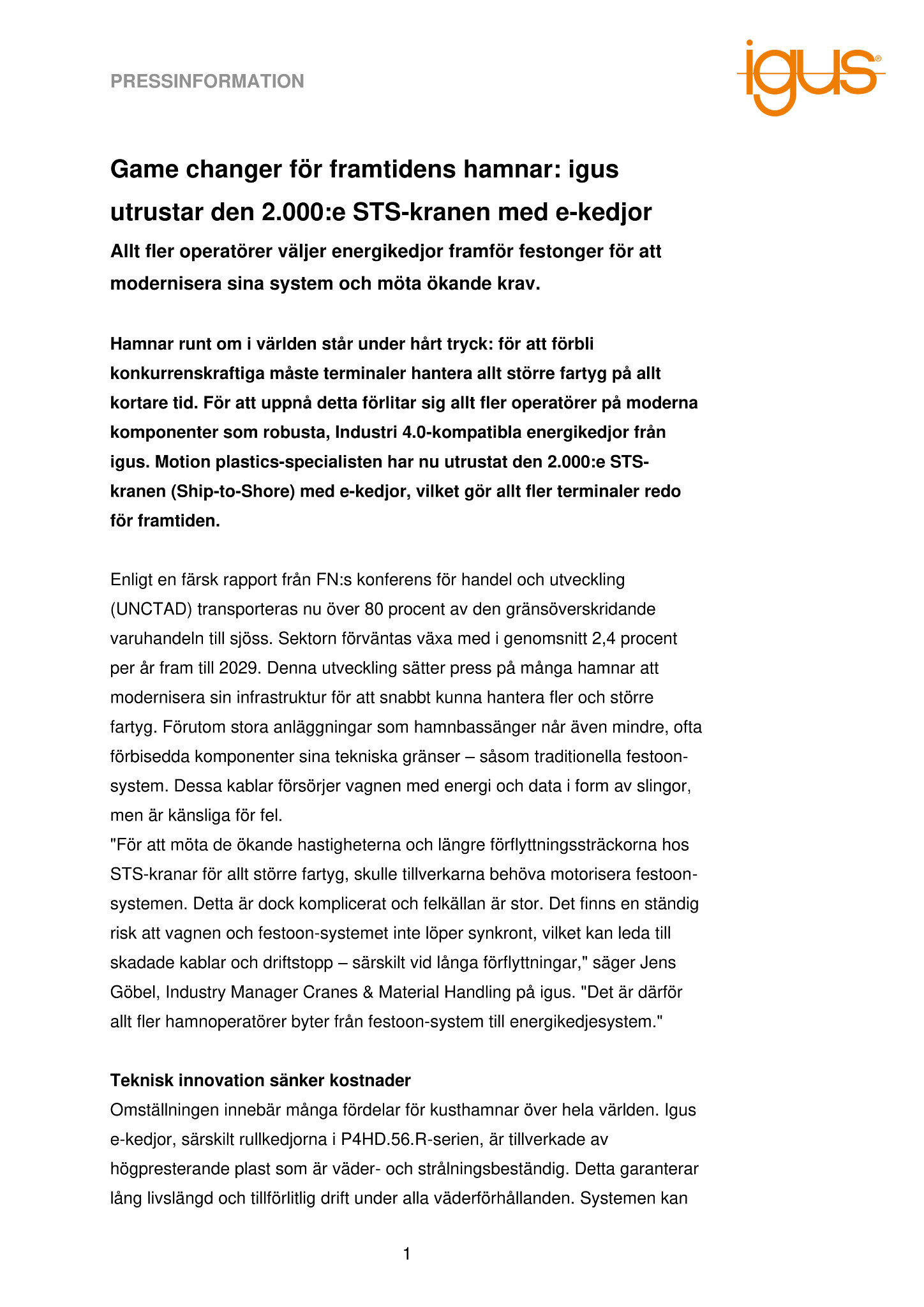 Med den 2.000:e installationen markerar igus ytterligare en milstolpe i hamnlogistikens framtid. Innovativa lösningar som det prisbelönta igus Mobile Shore Power Outlet (iMSPO), ett mobilt anslutningssystem för landström, visar hur hamnar kan minska sina miljöavtryck. Samtidigt har igus utvecklat smörj- och underhållsfria högbelastningslager i fiberkomposit, vilket minimerar underhållskostnader och eliminerar risken för felaktig smörjning.