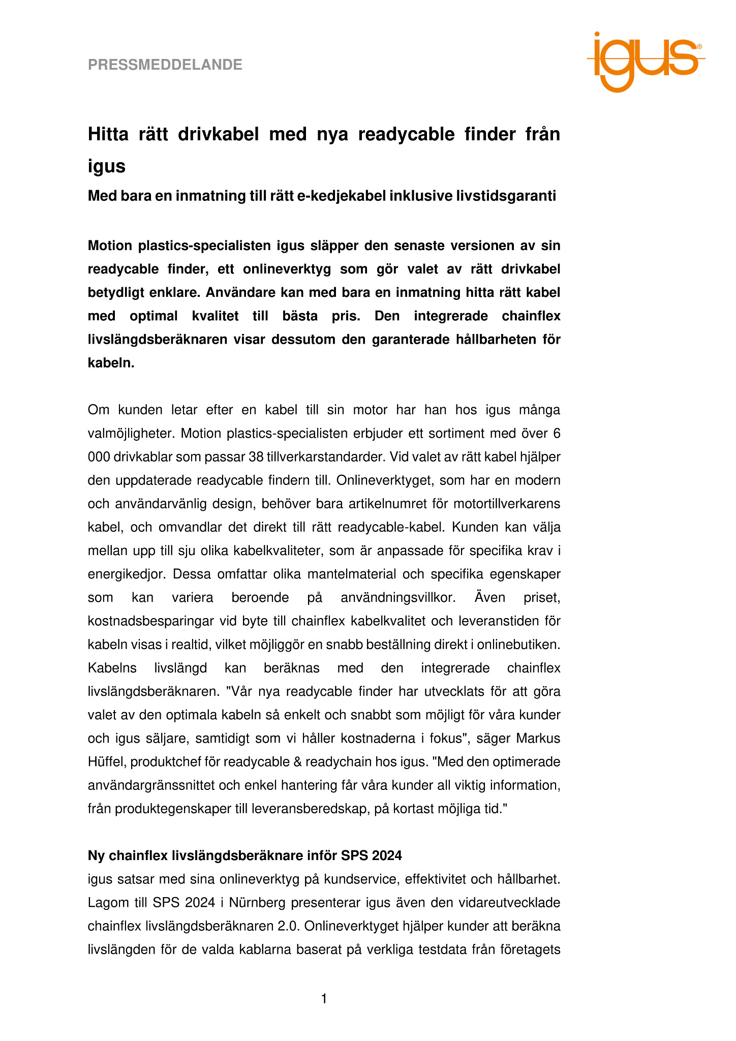 Om kunden letar efter en kabel till sin motor har han hos igus många valmöjligheter. Motion plastics-specialisten erbjuder ett sortiment med över 6 000 drivkablar som passar 38 tillverkarstandarder. Vid valet av rätt kabel hjälper den uppdaterade readycable findern till. Onlineverktyget, som har en modern och användarvänlig design, behöver bara artikelnumret för motortillverkarens kabel, och omvandlar det direkt till rätt readycable-kabel. Kunden kan välja mellan upp till sju olika kabelkvaliteter, som är anpassade för specifika krav i energikedjor. Dessa omfattar olika mantelmaterial och specifika egenskaper som kan variera beroende på användningsvillkor. Även priset, kostnadsbesparingar vid byte till chainflex kabelkvalitet och leveranstiden för kabeln visas i realtid, vilket möjliggör en snabb beställning direkt i onlinebutiken. Kabelns livslängd kan beräknas med den integrerade chainflex livslängdsberäknaren. ”Vår nya readycable finder har utvecklats för att göra valet av den optimala kabeln så enkelt och snabbt som möjligt för våra kunder och igus säljare, samtidigt som vi håller kostnaderna i fokus”, säger Markus Hüffel, produktchef för readycable & readychain hos igus. ”Med den optimerade användargränssnittet och enkel hantering får våra kunder all viktig information, från produktegenskaper till leveransberedskap, på kortast möjliga tid.”