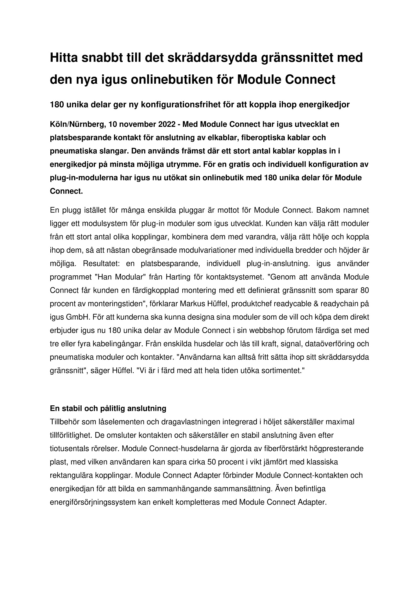 En plugg istället för många enskilda pluggar är mottot för Module Connect. Bakom namnet ligger ett modulsystem för plug-in moduler som igus utvecklat. Kunden kan välja rätt moduler från ett stort antal olika kopplingar, kombinera dem med varandra, välja rätt hölje och koppla ihop dem, så att nästan obegränsade modulvariationer med individuella bredder och höjder är möjliga. Resultatet: en platsbesparande, individuell plug-in-anslutning. igus använder programmet ”Han Modular” från Harting för kontaktsystemet. ”Genom att använda Module Connect får kunden en färdigkopplad montering med ett definierat gränssnitt som sparar 80 procent av monteringstiden”, förklarar Markus Hüffel, produktchef readycable & readychain på igus GmbH. För att kunderna ska kunna designa sina moduler som de vill och köpa dem direkt erbjuder igus nu 180 unika delar av Module Connect i sin webbshop förutom färdiga set med tre eller fyra kabelingångar. Från enskilda husdelar och lås till kraft, signal, dataöverföring och pneumatiska moduler och kontakter. ”Användarna kan alltså fritt sätta ihop sitt skräddarsydda gränssnitt”, säger Hüffel. ”Vi är i färd med att hela tiden utöka sortimentet.”