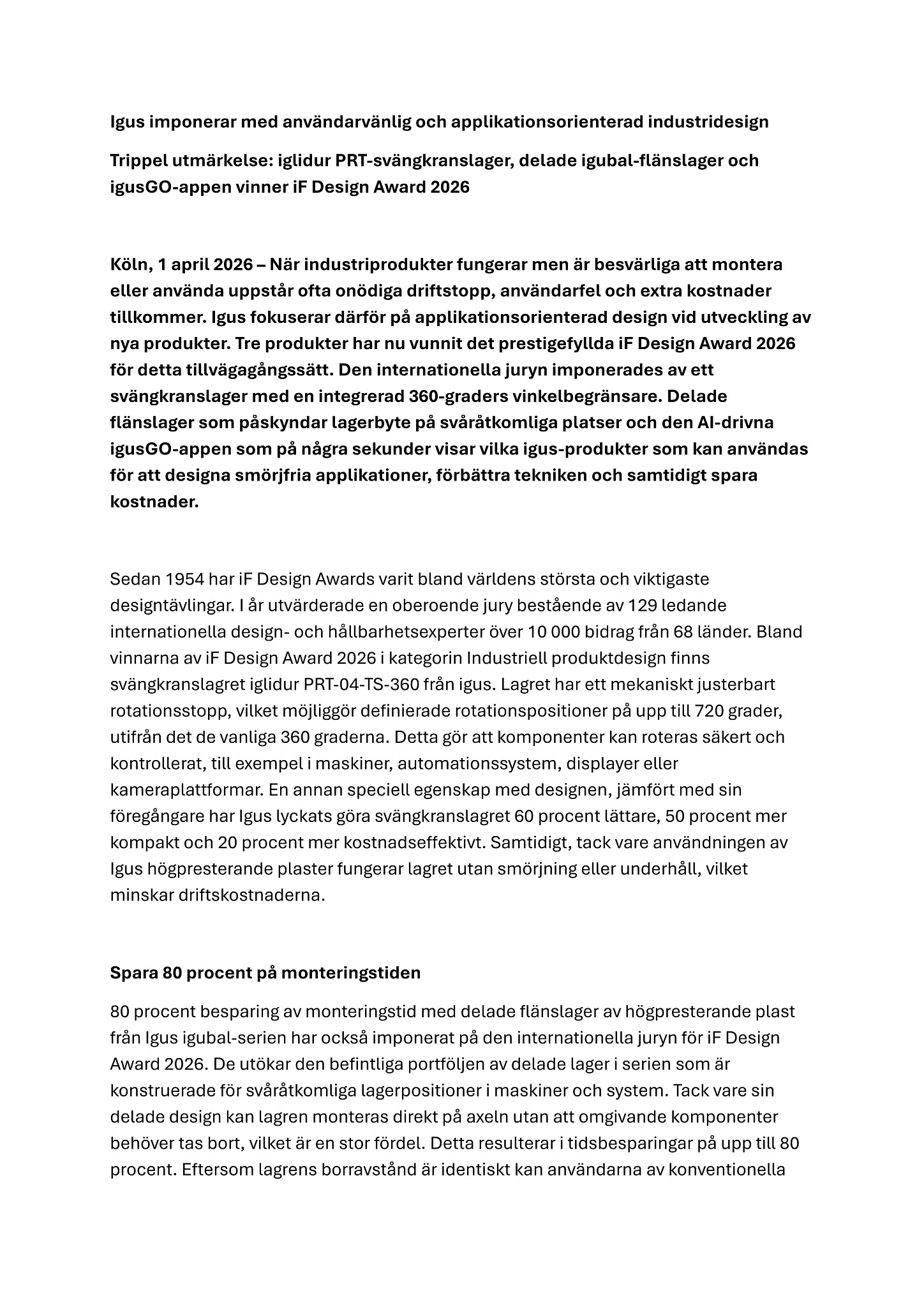 Köln, 1 april 2026 – När industriprodukter fungerar men är besvärliga att montera eller använda uppstår ofta onödiga driftstopp, användarfel och extra kostnader tillkommer. Igus fokuserar därför på applikationsorienterad design vid utveckling av nya produkter. Tre produkter har nu vunnit det prestigefyllda iF Design Award 2026 för detta tillvägagångssätt. Den internationella juryn imponerades av ett svängkranslager med en integrerad 360-graders vinkelbegränsare. Delade flänslager som påskyndar lagerbyte på svåråtkomliga platser och den AI-drivna igusGO-appen som på några sekunder visar vilka igus-produkter som kan användas för att designa smörjfria applikationer, förbättra tekniken och samtidigt spara kostnader.