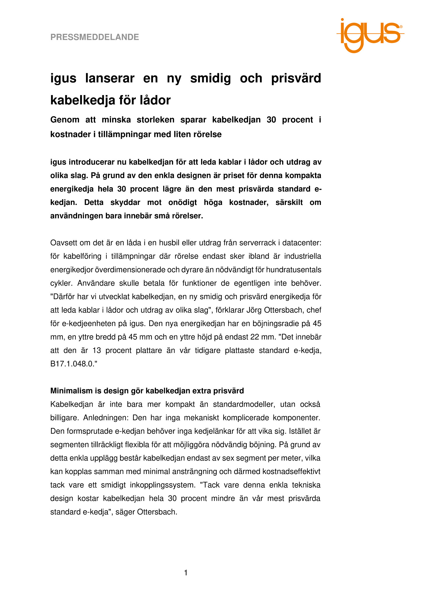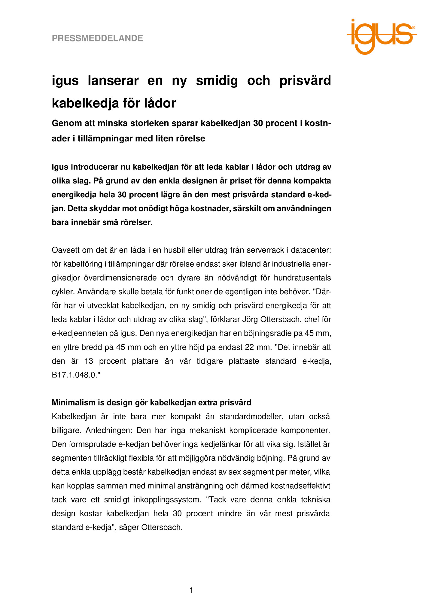 Oavsett om det är en låda i en husbil eller utdrag från serverrack i datacenter: för kabelföring i tillämpningar där rörelse endast sker ibland är industriella ener-gikedjor överdimensionerade och dyrare än nödvändigt för hundratusentals cykler. Användare skulle betala för funktioner de egentligen inte behöver. ”Där-för har vi utvecklat kabelkedjan, en ny smidig och prisvärd energikedja för att leda kablar i lådor och utdrag av olika slag”, förklarar Jörg Ottersbach, chef för e-kedjeenheten på igus. Den nya energikedjan har en böjningsradie på 45 mm, en yttre bredd på 45 mm och en yttre höjd på endast 22 mm. ”Det innebär att den är 13 procent plattare än vår tidigare plattaste standard e-kedja, B17.1.048.0.”