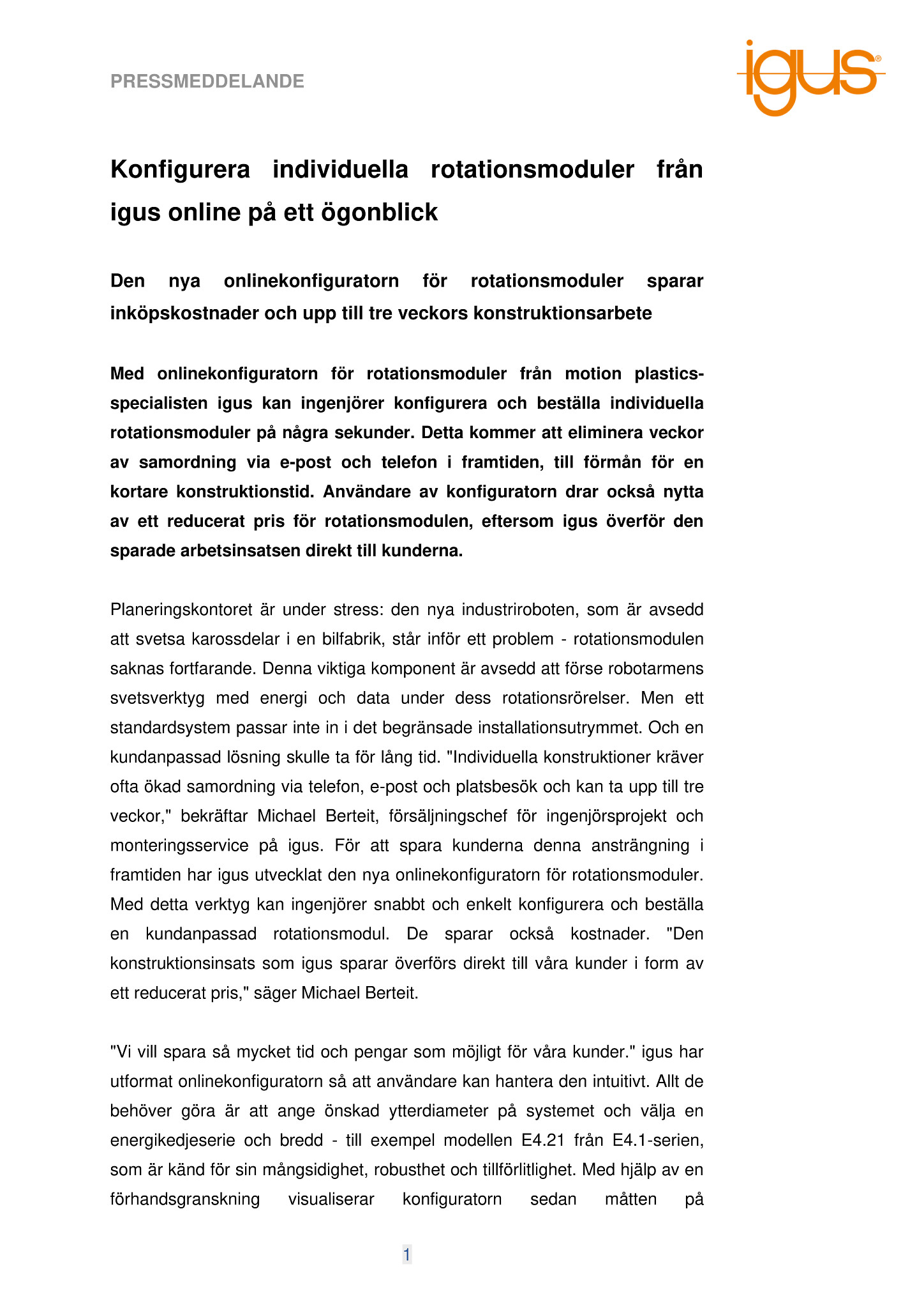 Planeringskontoret är under stress: den nya industriroboten, som är avsedd att svetsa karossdelar i en bilfabrik, står inför ett problem – rotationsmodulen saknas fortfarande. Denna viktiga komponent är avsedd att förse robotarmens svetsverktyg med energi och data under dess rotationsrörelser. Men ett standardsystem passar inte in i det begränsade installationsutrymmet. Och en kundanpassad lösning skulle ta för lång tid. ”Individuella konstruktioner kräver ofta ökad samordning via telefon, e-post och platsbesök och kan ta upp till tre veckor,” bekräftar Michael Berteit, försäljningschef för ingenjörsprojekt och monteringsservice på igus. För att spara kunderna denna ansträngning i framtiden har igus utvecklat den nya onlinekonfiguratorn för rotationsmoduler. Med detta verktyg kan ingenjörer snabbt och enkelt konfigurera och beställa en kundanpassad rotationsmodul. De sparar också kostnader. ”Den konstruktionsinsats som igus sparar överförs direkt till våra kunder i form av ett reducerat pris,” säger Michael Berteit.