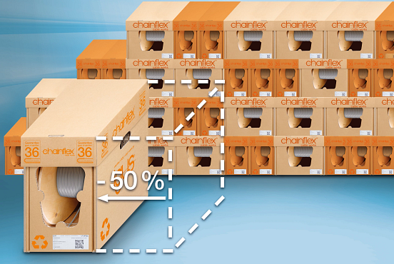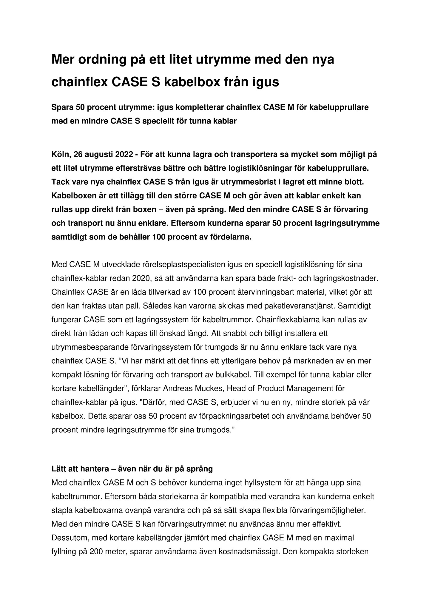 Med CASE M utvecklade rörelseplastspecialisten igus en speciell logistiklösning för sina chainflex-kablar redan 2020, så att användarna kan spara både frakt- och lagringskostnader. Chainflex CASE är en låda tillverkad av 100 procent återvinningsbart material, vilket gör att den kan fraktas utan pall. Således kan varorna skickas med paketleveranstjänst. Samtidigt fungerar CASE som ett lagringssystem för kabeltrummor. Chainflexkablarna kan rullas av direkt från lådan och kapas till önskad längd. Att snabbt och billigt installera ett utrymmesbesparande förvaringssystem för trumgods är nu ännu enklare tack vare nya chainflex CASE S. ”Vi har märkt att det finns ett ytterligare behov på marknaden av en mer kompakt lösning för förvaring och transport av bulkkabel. Till exempel för tunna kablar eller kortare kabellängder”, förklarar Andreas Muckes, Head of Product Management för chainflex-kablar på igus. ”Därför, med CASE S, erbjuder vi nu en ny, mindre storlek på vår kabelbox. Detta sparar oss 50 procent av förpackningsarbetet och användarna behöver 50 procent mindre lagringsutrymme för sina trumgods.”