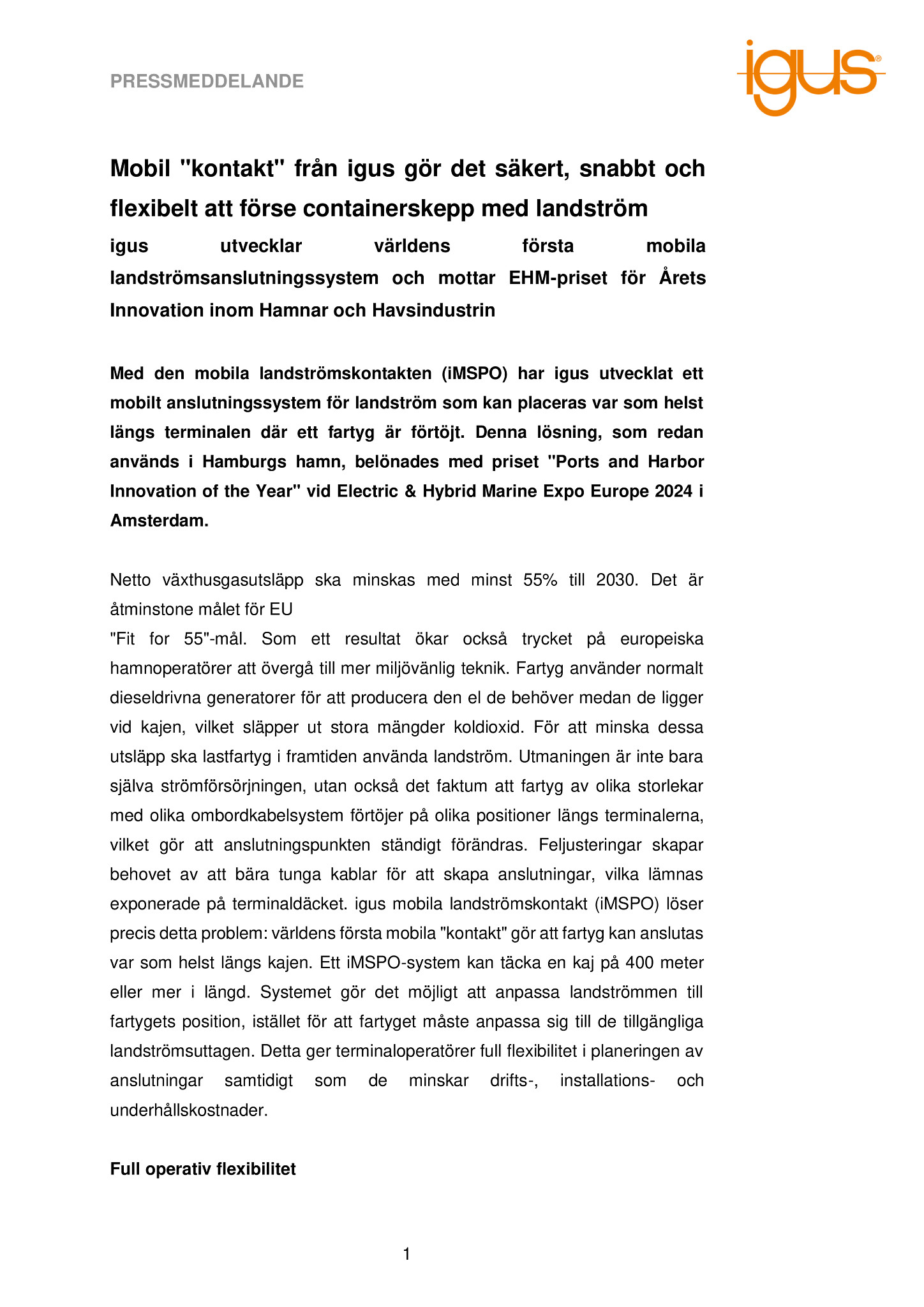 ”Fit for 55”-mål. Som ett resultat ökar också trycket på europeiska hamnoperatörer att övergå till mer miljövänlig teknik. Fartyg använder normalt dieseldrivna generatorer för att producera den el de behöver medan de ligger vid kajen, vilket släpper ut stora mängder koldioxid. För att minska dessa utsläpp ska lastfartyg i framtiden använda landström. Utmaningen är inte bara själva strömförsörjningen, utan också det faktum att fartyg av olika storlekar med olika ombordkabelsystem förtöjer på olika positioner längs terminalerna, vilket gör att anslutningspunkten ständigt förändras. Feljusteringar skapar behovet av att bära tunga kablar för att skapa anslutningar, vilka lämnas exponerade på terminaldäcket. igus mobila landströmskontakt (iMSPO) löser precis detta problem: världens första mobila ”kontakt” gör att fartyg kan anslutas var som helst längs kajen. Ett iMSPO-system kan täcka en kaj på 400 meter eller mer i längd. Systemet gör det möjligt att anpassa landströmmen till fartygets position, istället för att fartyget måste anpassa sig till de tillgängliga landströmsuttagen. Detta ger terminaloperatörer full flexibilitet i planeringen av anslutningar samtidigt som de minskar drifts-, installations- och underhållskostnader.